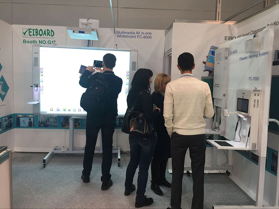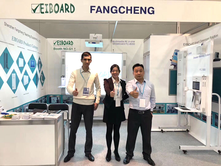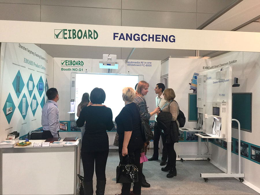此次展會上,方成教學的一體化電子白板FC-8000非常引人注目,它集成了電子白板,OPS電腦,音箱,展臺和中控系統于一體,配合強大的白板軟件和教學管理軟件,能夠實現網絡控制,視頻錄播,互動傳屏,校園廣播等功能,讓前來體驗的眾多俄羅斯學校老師和學生都大開眼界,稱贊不已。